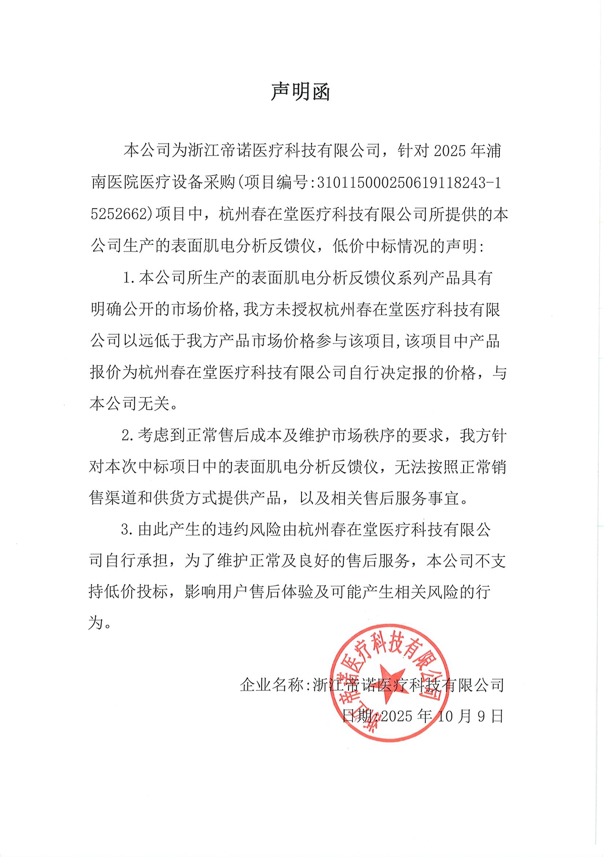 上海市浦东新区浦南医院价格声明函