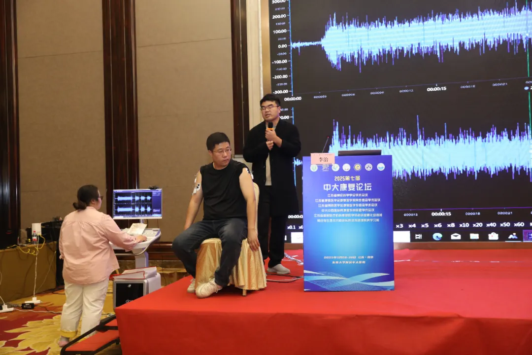 作为本次论坛的一大亮点,廖志平教授主持的“表面肌电实践操作”环节受到与会者的高度关注。在实操演示中,专家团队现场展示了表面肌电设备的电极贴放、信号采集、噪声滤除、实时反馈及数据分析全流程操作。参会者通过大屏幕清晰观看到高质量肌电信号的获取过程,并学习了常见干扰信号的识别与处理方法。现场互动积极,疑问解答及时,有效提升了学员对表面肌电技术的实际操作与临床判读能力,实现了从理论到实践的顺畅过渡。